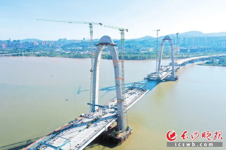 兴联路大桥是长沙目前在建桥面最宽、单跨最大、桥长最长的过江大桥。均为长沙晚报全媒体记者 王志伟 摄