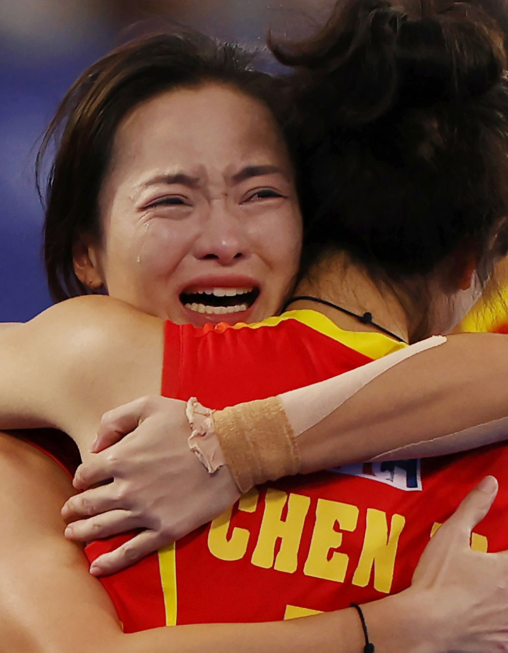 ↑中国队球员欧紫霞(左)在赛后激动落泪。