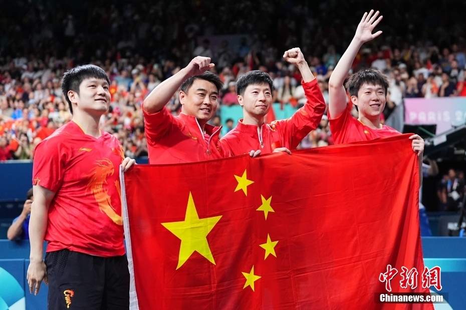 当地时间8月9日,中国队庆祝胜利。当日,在巴黎奥运会乒乓球男团金牌赛中,中国队以3比0战胜瑞典队,获得冠军。