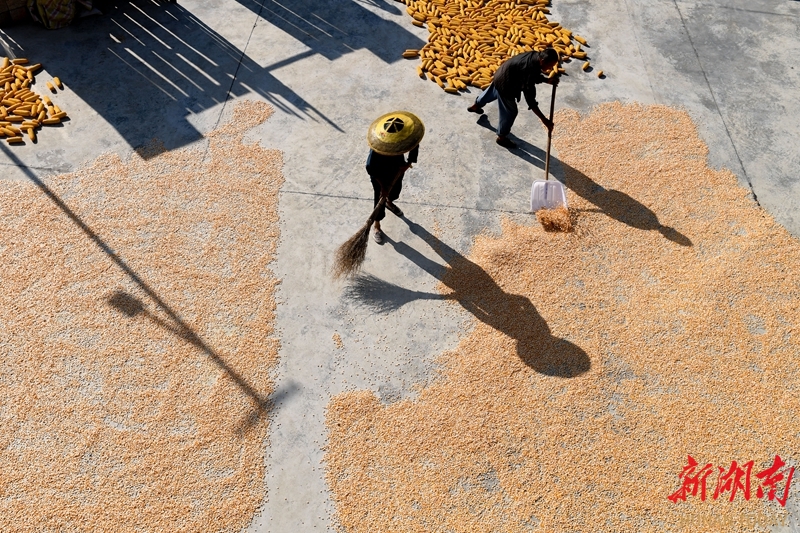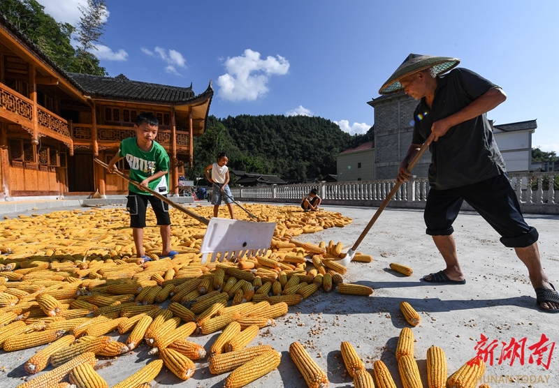8月19日,花垣县石栏镇董马村,农民在晾晒玉米。时下,当地玉米陆续进入收割期,农民加紧收割、晾晒,确保颗粒归仓。龙恩泽 摄(湖南图片库)