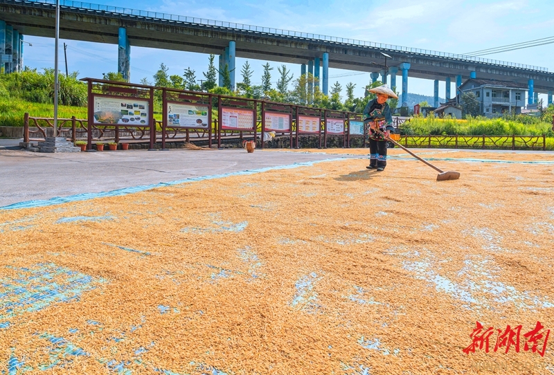8月19日,吉首市矮寨镇排兄村,农民在晾晒稻谷。时下,当地优质水稻“玉针香”迎来收割期,农民加紧收割、晾晒,确保颗粒归仓。梁永鸿 摄