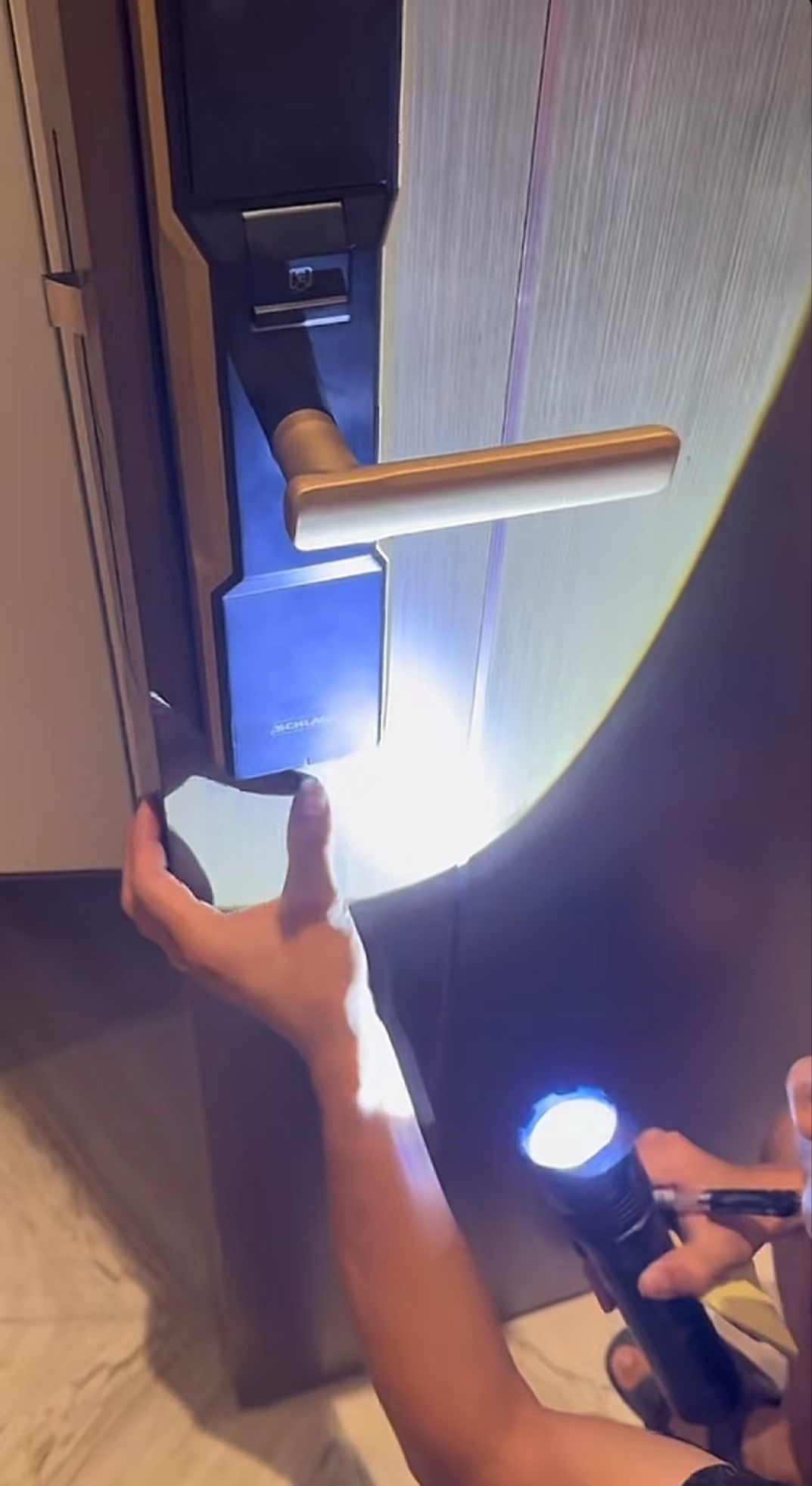 8月22日,湖南日报记者关注了陈女士的视频账号。近期的两段视频中显示,一名男子拿着手电筒对着墙壁、房门等一处一处地查看,并不时拿出字条写上字后贴在发现“问题”的地方。