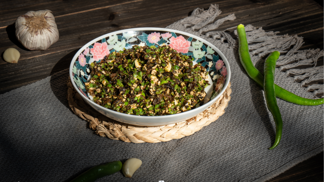 醴陵青椒炒搓菜看上去黑乎乎的东西其实是腌制过后晒干的荠菜,可能是添加了时光的风味,才让这道菜显得格外独特。青椒、搓菜用猪油爆炒出香气辛辣,渗进搓菜的每一寸肌理和米饭在一起真的绝配。