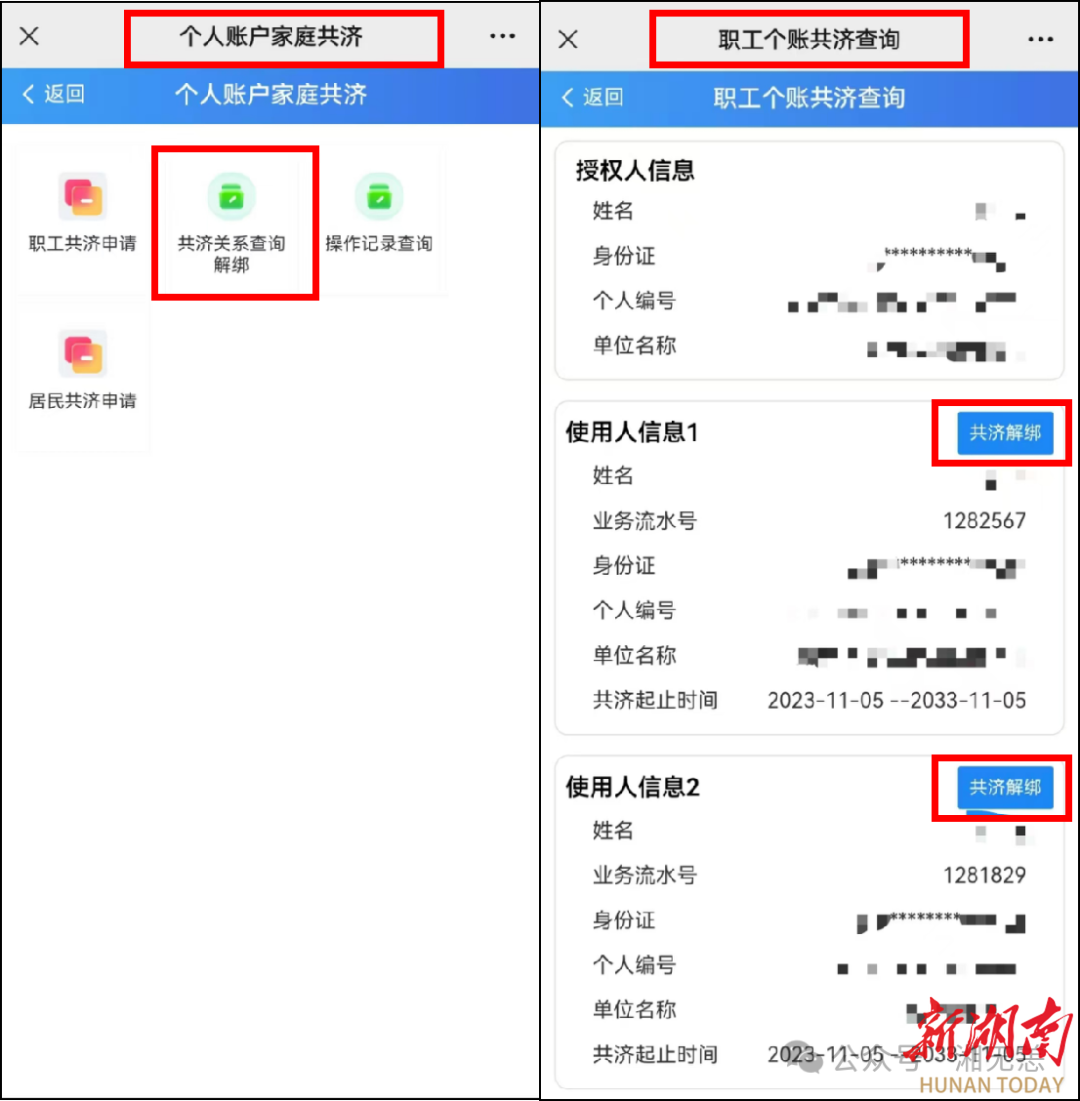 参保职工在个人账户家庭共济管理页面,可查询绑定的近亲属账户信息。如需要解除绑定关系,参保职工可点击“共济关系查询解绑”进行解绑操作。同一人反复被绑定、解绑,仍然只使用1个共济名额。参保职工一生中可累计授权共济20人。