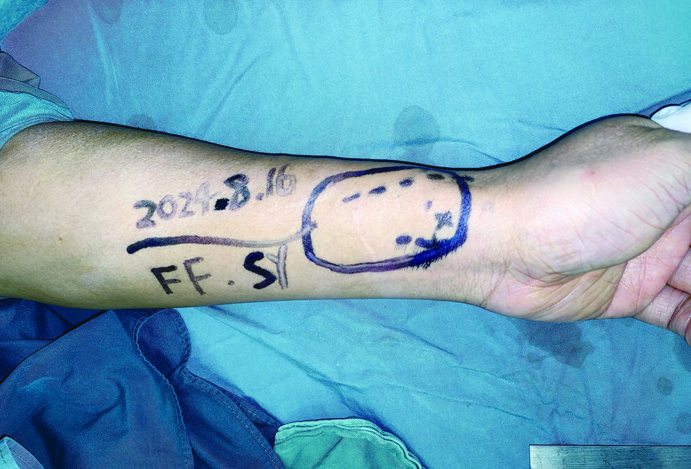 如何既要彻底切除肿瘤,又要尽量不影响外观功能?患者虽然是口腔癌,且肿瘤范围较大,但是没有往深部肌肉及面部皮肤浸润,肖小平团队决定,病灶的切除不切开口角、不切开面部皮肤,肿瘤的切除完全在口腔内进行,为了避免术后面部臃肿不对称畸形,采用更加轻薄的前臂皮瓣修复创面。前臂游离皮瓣具有皮瓣轻薄、质地柔软、解剖恒定、位置表浅、血管管径较粗、皮薄等诸多优点,适合颌面部中、小型组织缺损的修复。