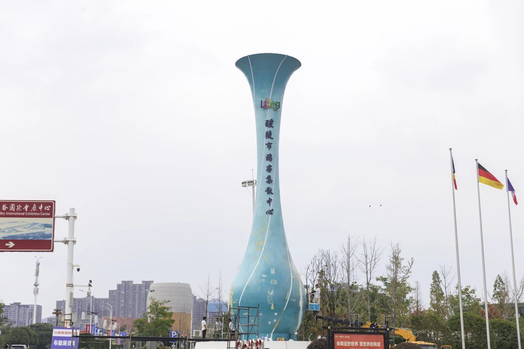 在中国陶瓷谷国际会展中心的前方,超大的“瓷瓶”让人眼前一亮,不仅和瓷谷建筑群相呼应,还特别衬托本次瓷博会的主题,在会展中心前坪,还可以看到,舞台正在有序搭建中。