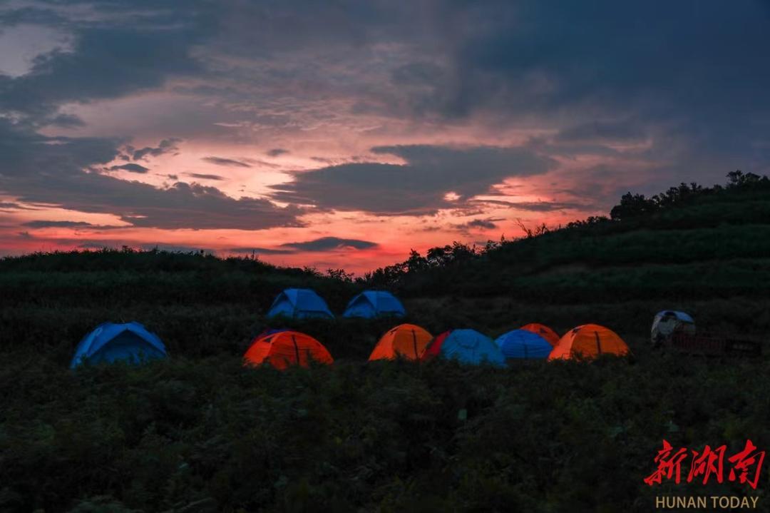 夕阳西下,晚霞染红了天,火红的太阳披上了一层朦胧的外衣。此时,帐篷外的你,与山川、草木融为一体,勾勒出了一幅绝美的画面。