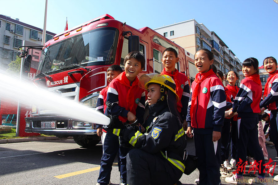 10月24日,少先队员在体验消防训练。当天,新田县枧头学校少先队员走进县消防救援大队,开展“红领巾寻访火焰蓝”校外主题实践活动,旨在让少先队员“零距离”体验消防生活,学习消防安全知识,提升应急避险能力。 陆锦涛 摄(湖南图片库)
