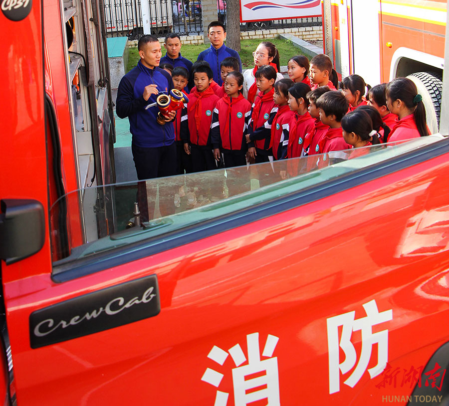 10月24日,少先队员在参观消防车辆。当天,新田县枧头学校少先队员走进县消防救援大队,开展“红领巾寻访火焰蓝”校外主题实践活动,旨在让少先队员“零距离”体验消防生活,学习消防安全知识,提升应急避险能力。 陆锦涛 摄(湖南图片库)