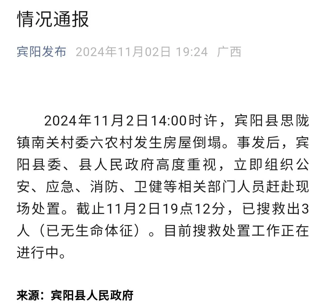 据“宾阳发布”19点24分通报消息:2024年11月2日14:00时许,宾阳县思陇镇南关村委六农村发生房屋倒塌。事发后,宾阳县委、县人民政府高度重视,立即组织公安、应急、消防、卫健等相关部门人员赶赴现场处置。截止11月2日19点12分,已搜救出3人(已无生命体征)。目前搜救处置工作正在进行中。