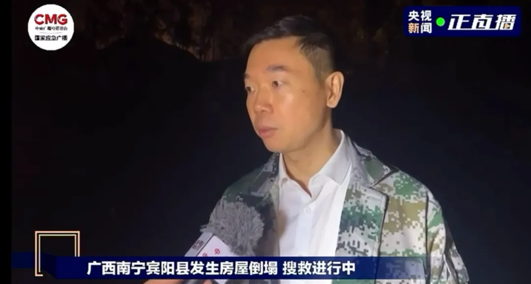 11月2日晚上9点多,宾阳县委副书记、县长廖伟行在事故现场接受了央视新闻记者的直播采访,回应倒塌事件相关情况。