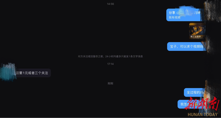 “需要1元或3个关注。”网友“沈**意”表示,自己有现场视频,求视频需要1元或3个关注;当新湖南记者以普通用户身份问及如何付款时,“沈**意”改口“给个关注就行”。获得关注后,网友发送该视频,同时附上南昌工学院学生聊天记录截图。
