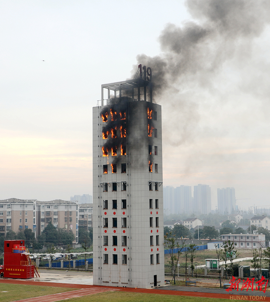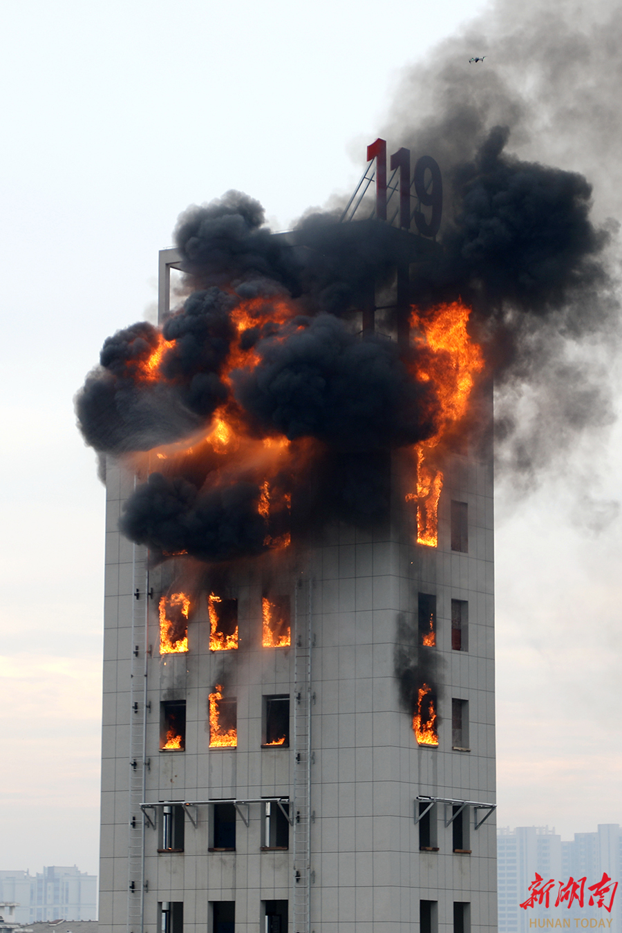 11月9日,常德市“119” 消防宣传月高层火灾实战演练现场,模拟高层燃气管道泄漏发生爆燃,119指挥中心调动高空灭火无人机、云梯车、举高车及危化品处置专业队等救援力量,第一时间控制火势蔓延、营救被困人员、快速有效地扑灭现场火势。图为模拟高层燃气管道泄漏引发火灾。 陈自德 摄(湖南图片库)
