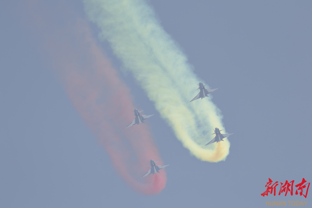11月12日,第十五届中国国际航空航天博览会首日,歼-20、运油-20、空军“八一”飞行表演队、“红鹰”飞行表演队亮相开幕式。图为 “红鹰”飞行表演队空中拉出道道彩烟。