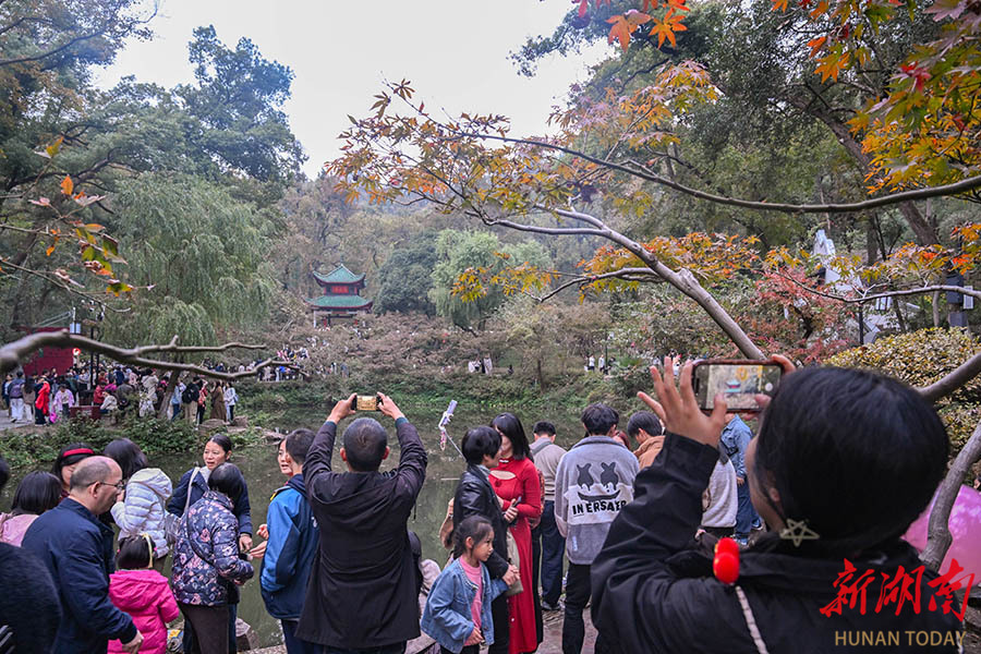 11月23日,长沙市岳麓山风景名胜区爱晚亭景点人气爆棚。当天,第十八届岳麓山红枫节开幕,层林尽染、绚丽多彩的岳麓山好“枫”景吸引了众多游客前来打卡。湖南日报全媒体记者 郭立亮 摄