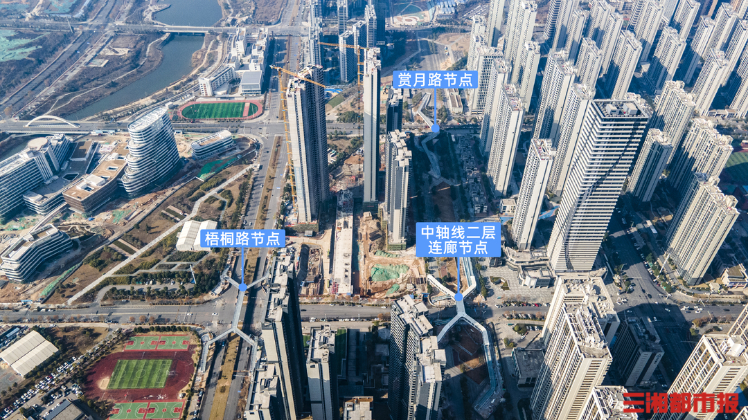中轴线二层连廊节点位于梅溪湖超级中轴与映日路相交处,主桥为44.5米钢箱梁桥,最大单跨为19米,桥梁总长432.9米。赏月路节点位于梅溪湖超级中轴与赏月路相交处,主桥为63米钢箱梁桥,最大单跨23米,桥梁总长287.2米。梧桐路节点位于梅溪湖超级中轴南侧,梧桐路与映日路相交处,主桥为110米钢箱梁桥,最大单跨50米,桥梁总长280.4米。