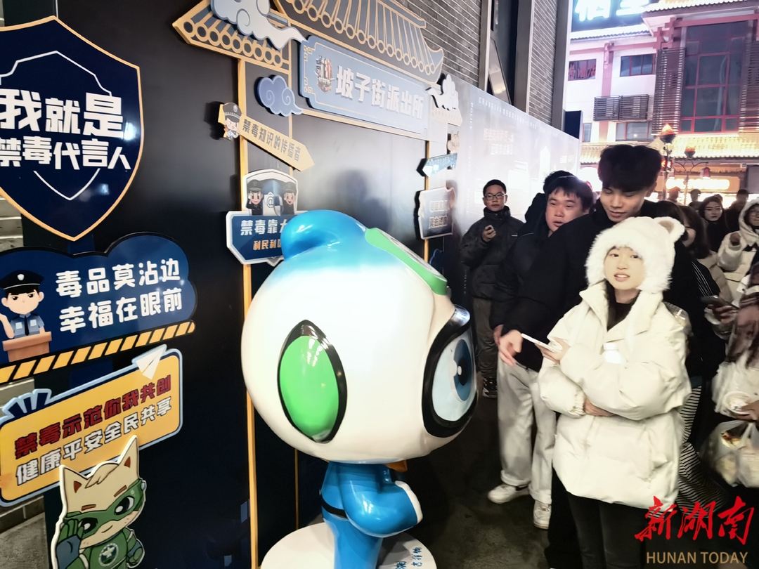 1月9日晚,游客在长沙市公安局天心分局坡子街派出所“打卡”。近年,随着警务纪实节目《守护解放西》火爆全网,坡子街派出所也随之火出圈,吸引众多游客争相“打卡”。近期,这处“网红打卡地”还增设了禁毒课堂,将禁毒宣传融入游客的“打卡”体验中,起到了很好的宣传效果。胡立强 摄(湖南图片库)
