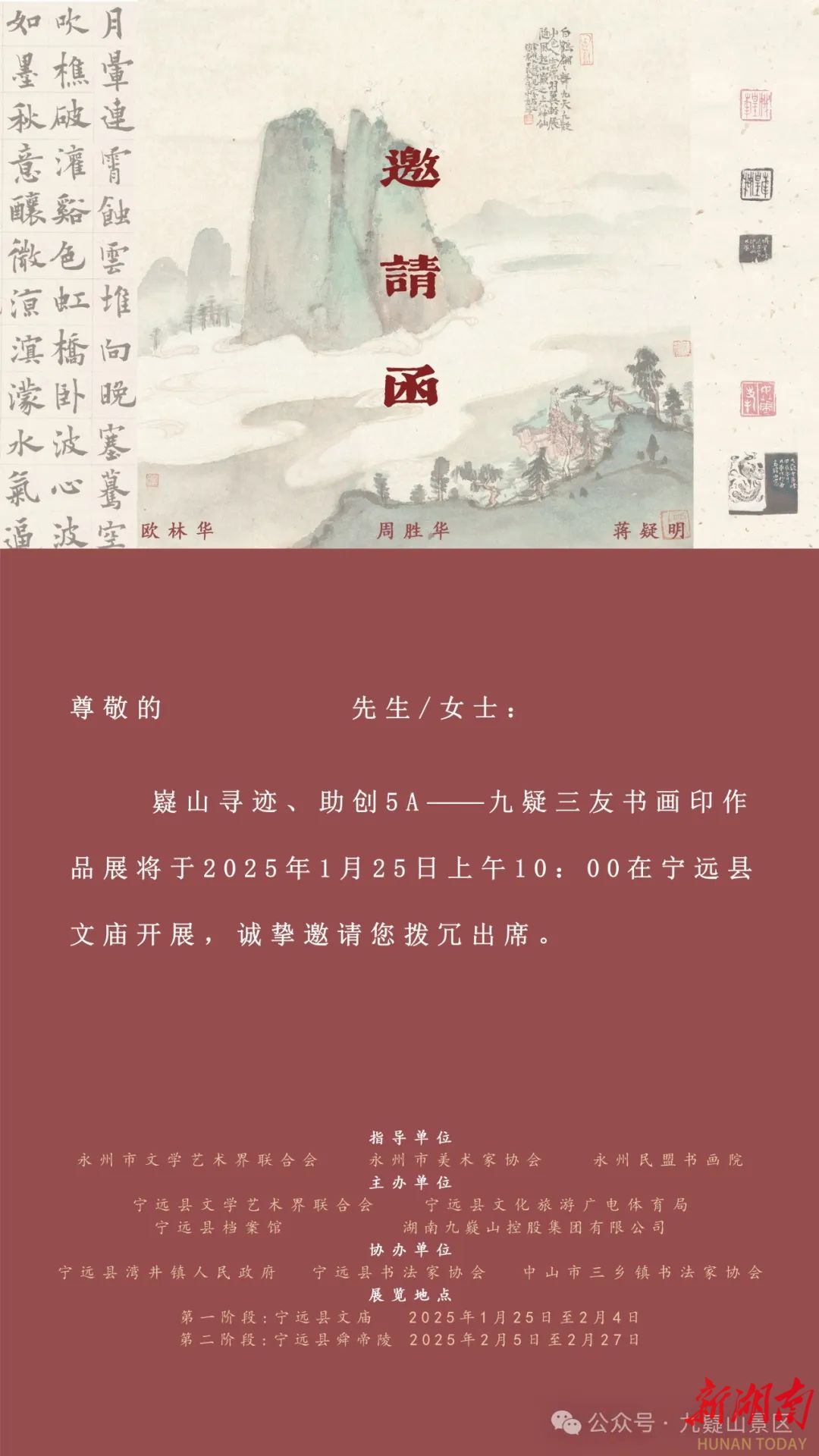 挥毫当得江山助,不到潇湘岂有诗!在九嶷山景区创建全国5A景区的关键之年和永州市第四届旅游发展大会即将在宁远县召开之际,“嶷山寻迹——九疑三友书画印作品展”顺利展出了。这是“美景不远,就在宁远”新年文旅融合开出的第一枝迎春花。