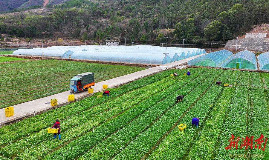 2月2日,新田县东升农场,村民在采收菜心。立春将至,当地农民忙着采收、分拣、包装时令鲜蔬,发往粤港澳地区,供应春节市场。 刘贵雄 陈祉凝 摄影报道(湖南图片库)