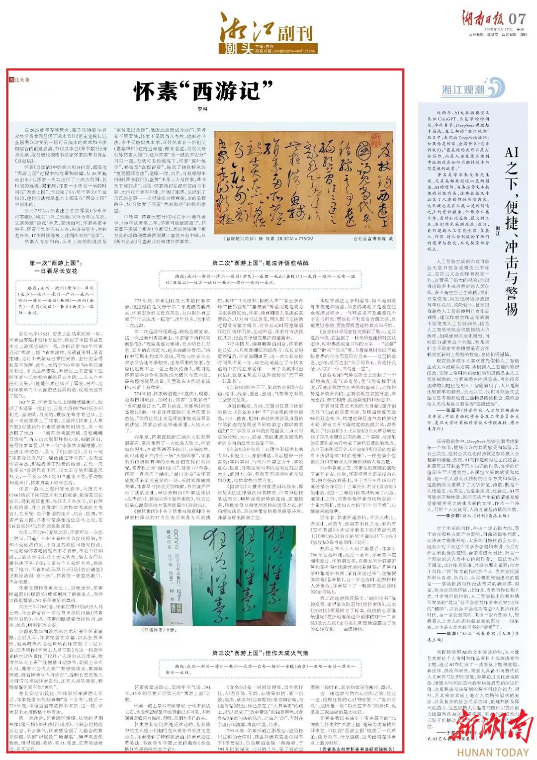 怀素《自叙帖》中的绝大部分内容,都是他“西游上国”过程中的故事和荣耀。从26岁起走出永州,怀素一生共进行了三次大范围、长时间的远游。据推测,怀素一生中有一半的时间在“西游上国”,而且除了《小草千字文(千金帖)》,他的书法精品基本上都是在“西游上国”中创作的。