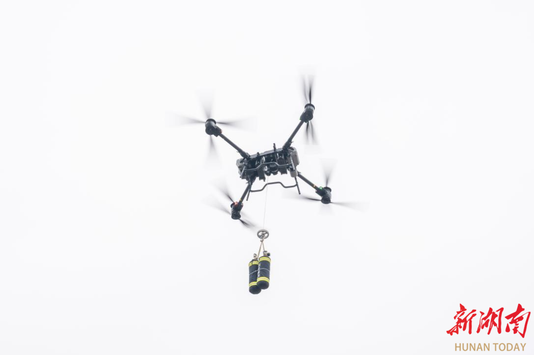 “物资装备完毕,可以起飞!”随着一声令下,一架载有两台重量约17斤空气呼吸器的无人机,便在长沙市消防救援支队指挥中心工作人员的操控下,稳稳地朝着百米高的建筑楼顶飞去,为救援人员送去关键装备。