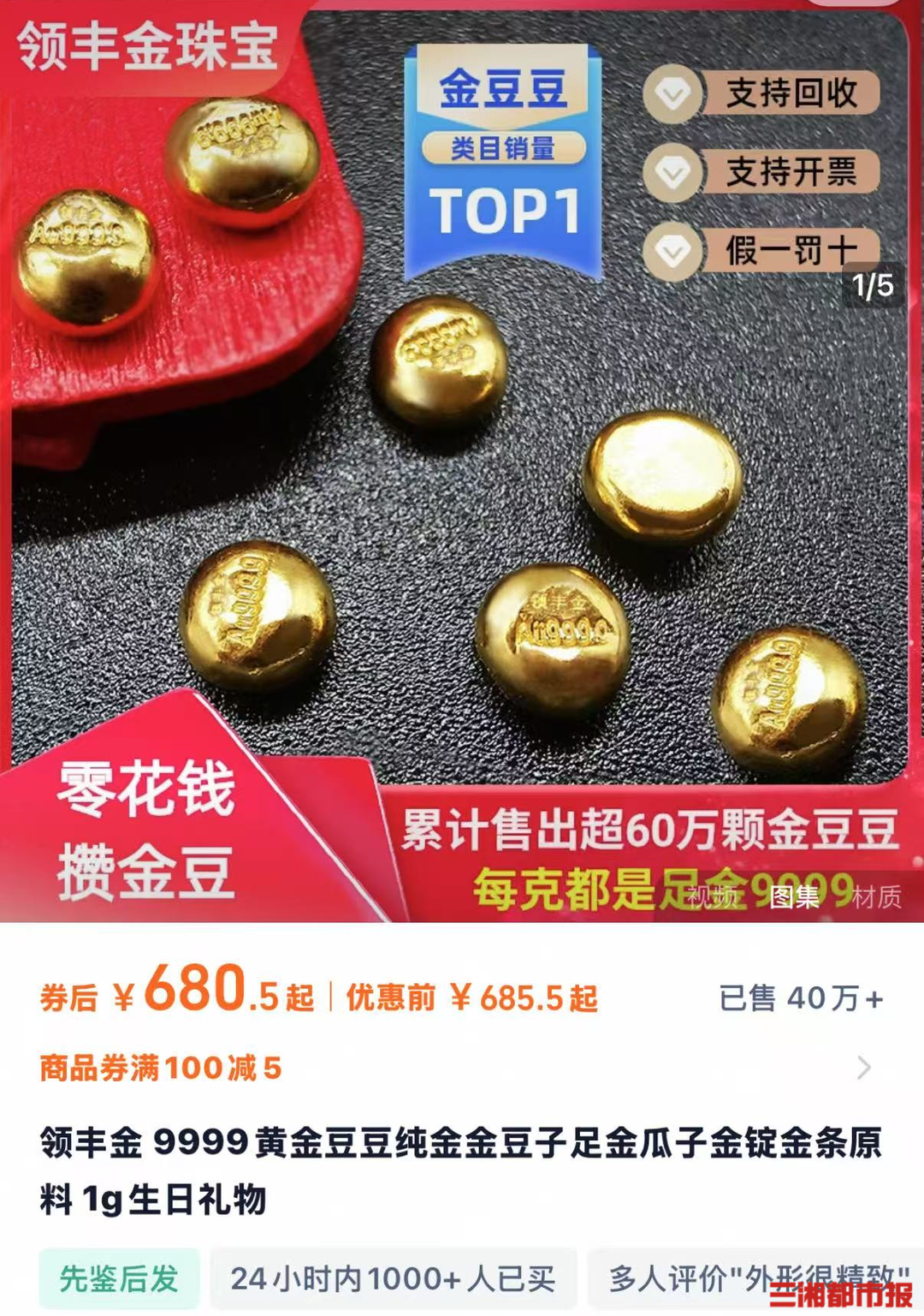 不仅是线下门店,线上门店也迎来了黄金销售潮。领丰金珠宝店,680.5元/克的金豆豆,24小时内已超1000余次购买;鑫韵黄金10克—100克不等的金条,24小时内已售600余件,其中价格为6772元10克重的金条,处缺货状态……