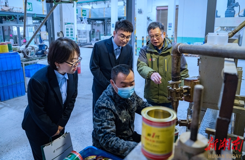 3月6日,邵阳市湖南把兄弟新材料股份有限公司生产车间,邮储银行工作人员开展贷后回访,了解企业资金使用情况和经营情况。近年,邮储银行邵东市支行充分发挥金融赋能企业发展作用,为实体经济高质量发展注入金融“活水”。湖南日报全媒体记者 李健 摄