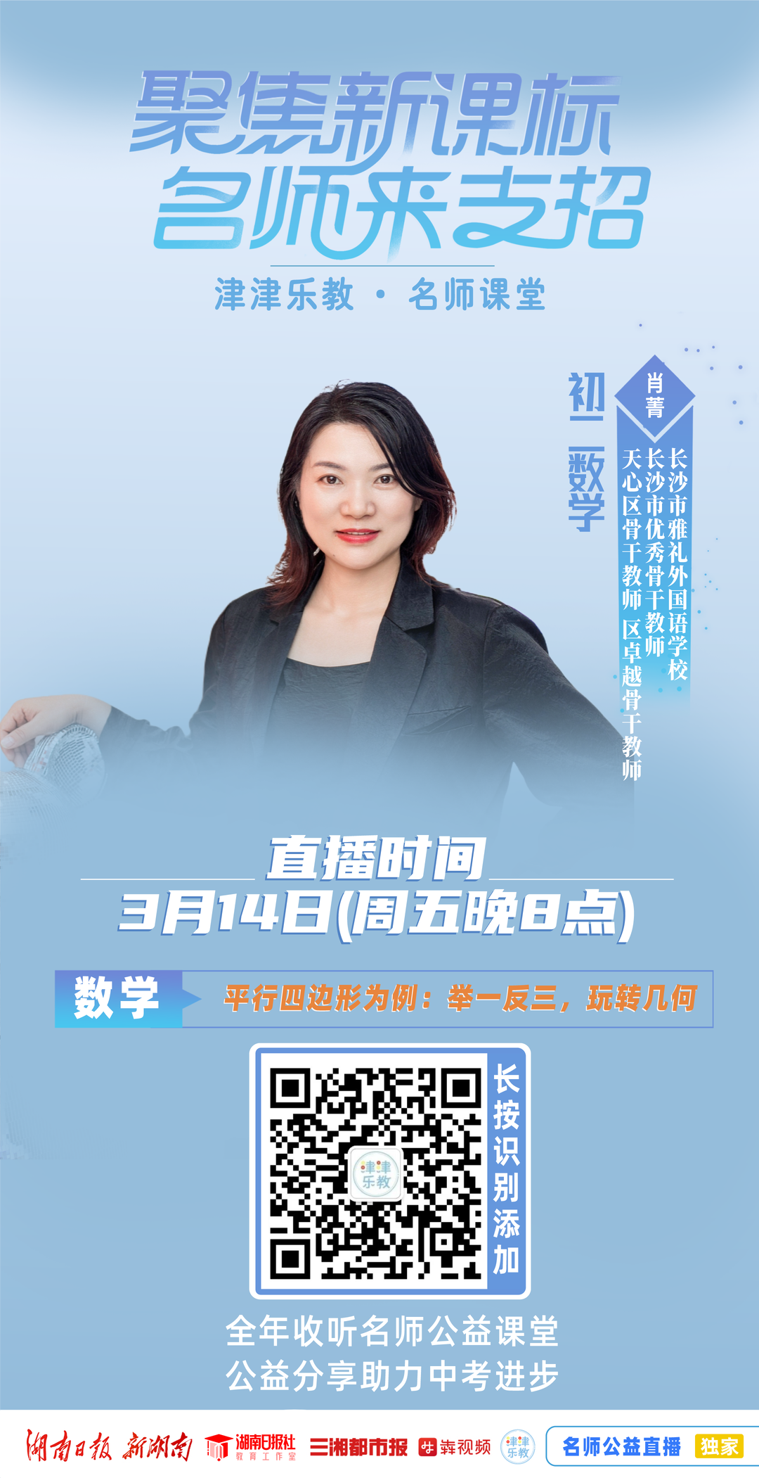 湖南日报3月12日讯(全媒体记者 蒋诗雨)注意啦!3月14日,本周五晚,长沙市雅礼外国语学校的两位名师将“空降”津津乐教·名师课堂直播间!赶快扫描海报下方二维码入群预约观看,一键Get几何、历史高分攻略!