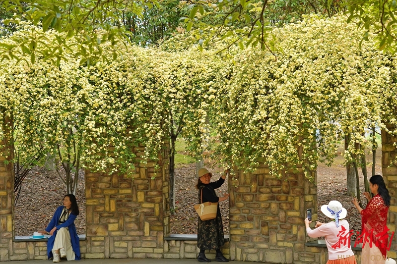 4月7日,市民在长沙市雨花区沙湾公园成片的黄色木香花墙前打卡留影。木香花是四月的“气质花”,开花时满墙繁花汇成花瀑,石砖框窗与明艳的木香花相映成趣,散发出诗意与浪漫的气息。湖南日报全媒体记者 徐行 摄