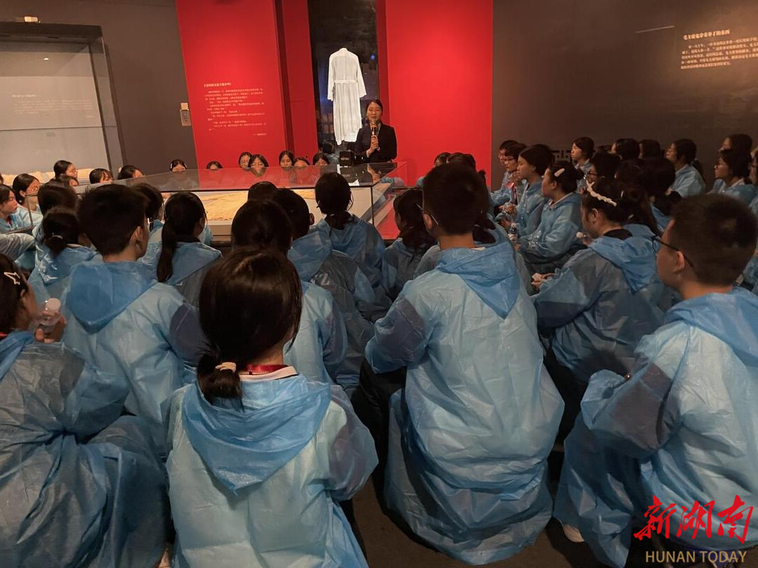 19日上午,研学队伍迎来最动人的一课。当集结号吹响时,天空正在飘雨,通往毛泽东同志纪念馆的柏油路泛起粼粼水光,同学们蓝色的雨衣连成了一片海。纪念馆内,泛黄的《湘江评论》、补丁摞补丁的中山装、批示文件的放大镜,件件展品都在诉说着“为有牺牲多壮志”的豪情。学子们驻足于“敢教日月换新天”的立体影像前,指尖轻触电子屏上的革命家书,在沉浸式体验中读懂“全心全意为人民服务”的初心密码。