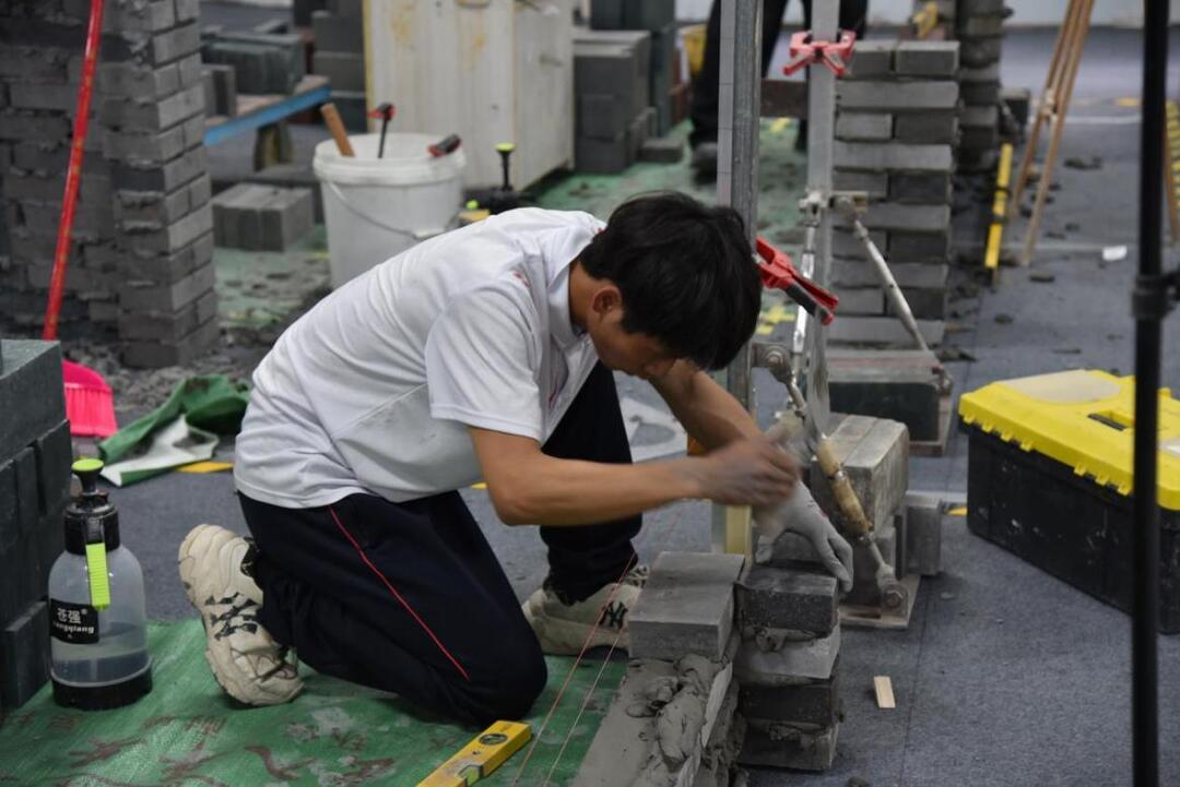 中建五局高级技工学校18岁小将周文俊参加砌筑项目技术比赛现场