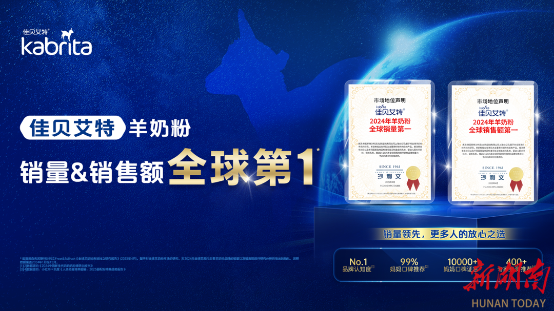 湖南日报·新湖南客户端5月7日讯(通讯员 周碧波)近日,澳优旗下佳贝艾特“领头羊”市场地位再获双料认证!国际权威调研公司弗若斯特沙利文(Frost&Sullivan)经市场研究确认:2024年佳贝艾特羊奶粉销量与销售额全球第一[1]。全球领先的消费者研究与零售监测公司尼尔森IQ(NielsenIQ)数据也显示:2024年佳贝艾特在中国进口婴幼童羊奶粉市场销售量份额及销售额份额均高达84%[2]。据此,佳贝艾特已连续7年在中国进口婴幼童羊奶粉市场份额超6成[3],“领头羊”地位持续稳固。