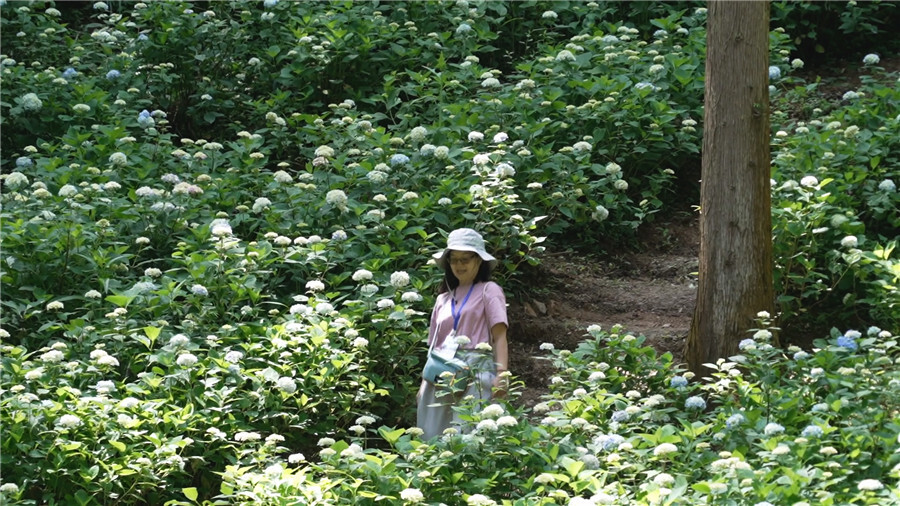 绣球花簇团团相接,层层晕染。微风吹拂,花影婆娑,数十种浪漫唯美的渐变色绣球花,如大自然打翻的调色盘,红、粉、蓝、紫交织,如梦似幻。绣球花序大而密集,花团锦簇,每一朵都绽放着独特的魅力,让游人如痴如醉。湖南艺术职业学院学生廖崧景说:“花海面积大、景色美,随手拍都很出片!”台湾游客江桂芬也称赞:“负氧离子充足,花海漂亮极了,希望花期再来打卡!”