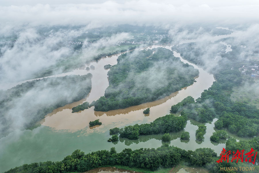 5月19日,道县祥霖铺镇两河口村,受近期持续强降雨影响,清澈的潇水河与浑浊的永明河交汇处出现“泾渭分明”景观。 蒋克青 摄(湖南图片库)
