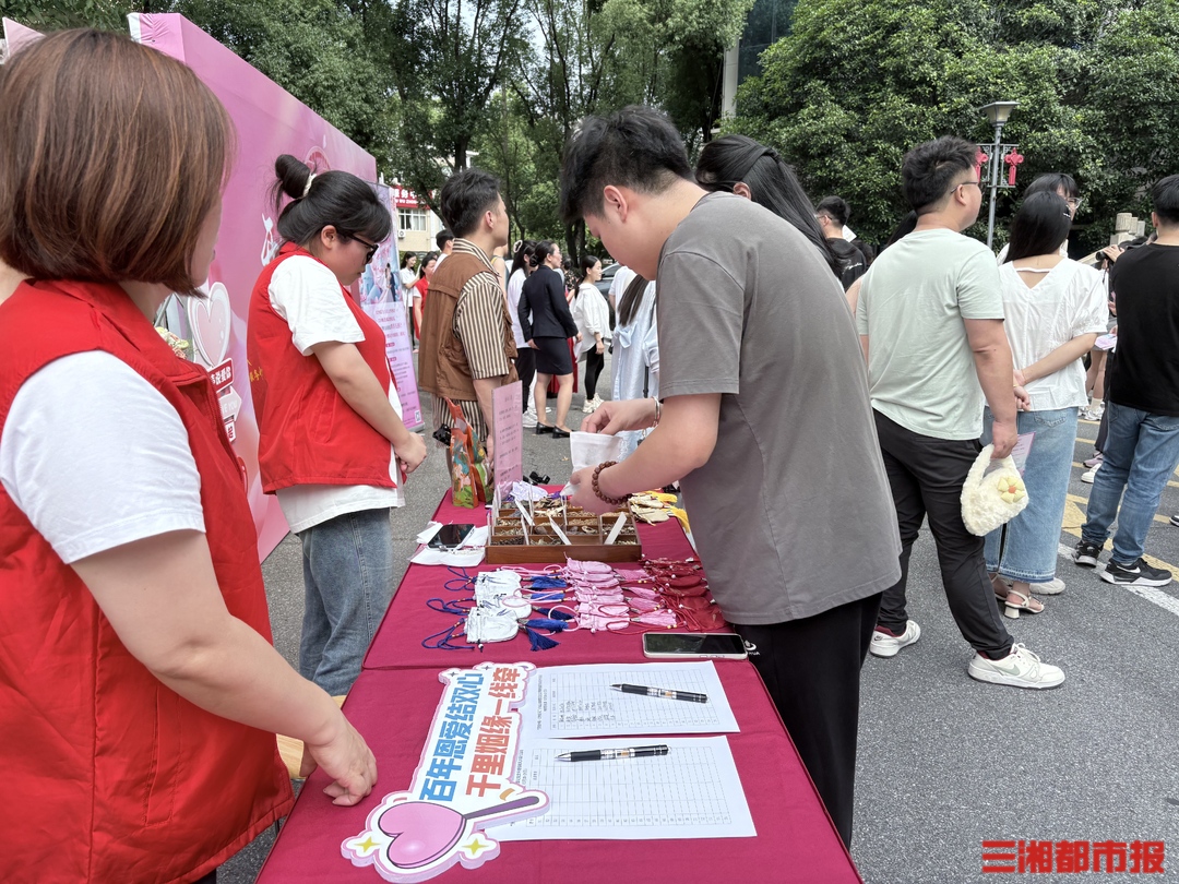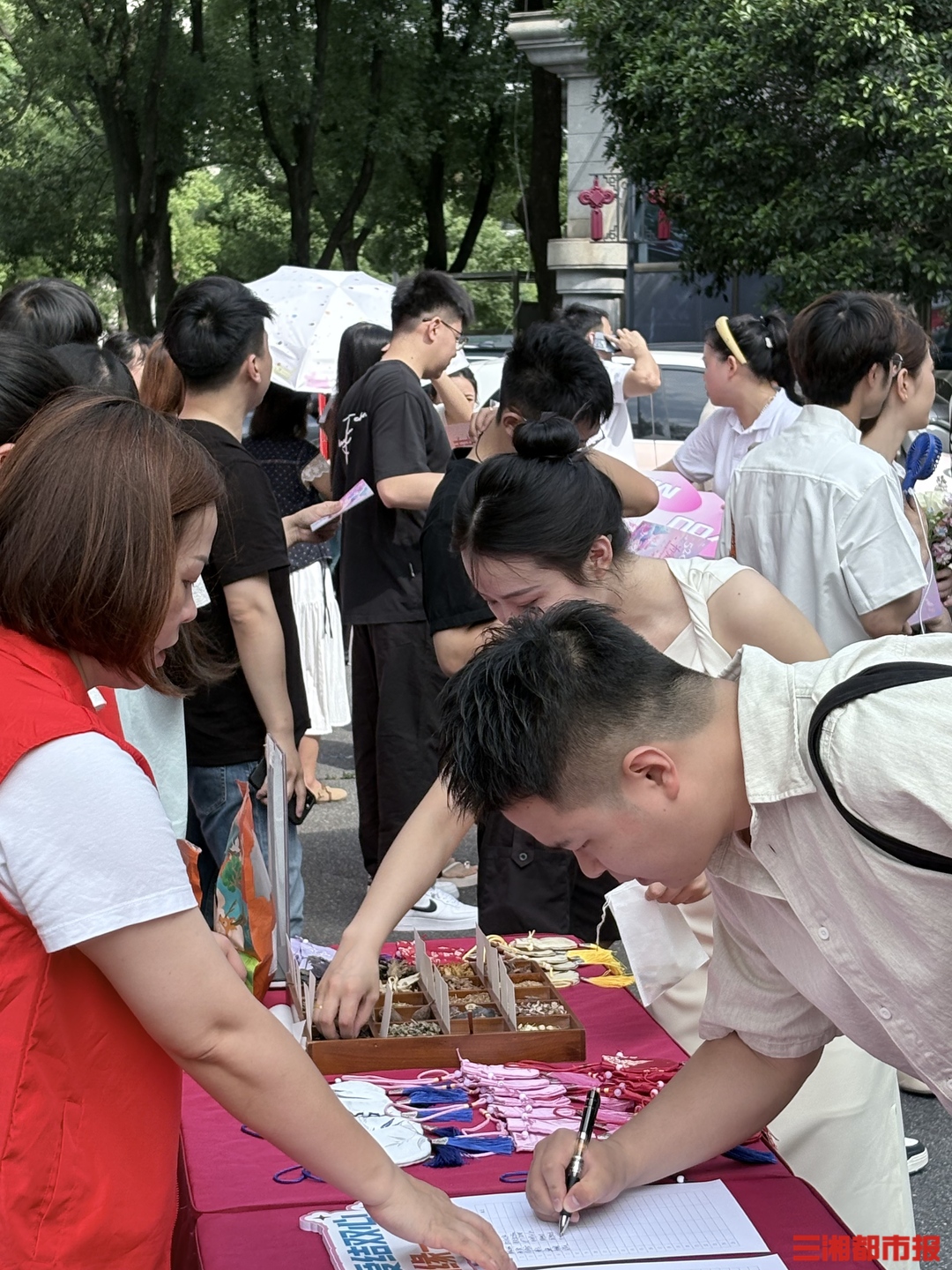 5月20日,长沙市开福区民政局婚姻登记处门口,“开窗纳福,定格新风”开福区婚姻登记处文明婚俗新风尚宣传活动正在进行。不少新人现场领取物料,携手制作手工香囊。一枚枚精致的香囊,饱含了新人们对美好生活的幸福向往。(文/视频 高煜棋 通讯员 刘艺博)