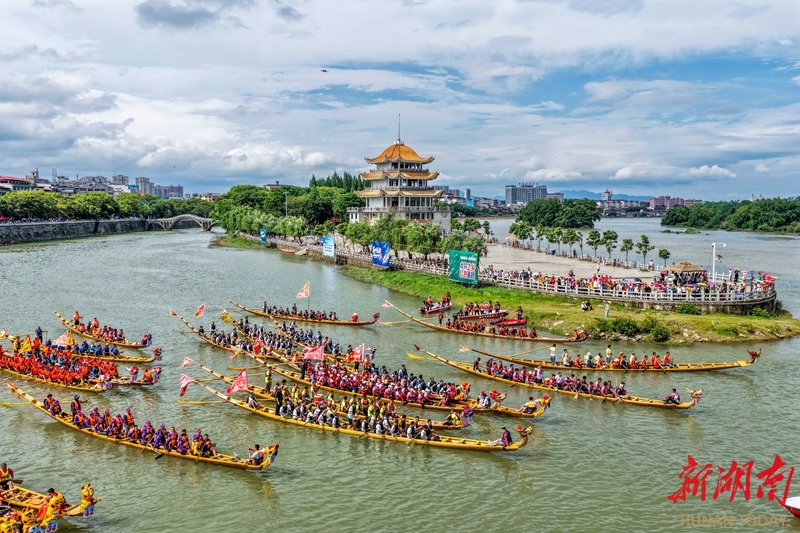 5月20日,龙船队齐聚在潇水河上,准备巡游。端午节临近,道县举行龙船巡游,迎接佳节到来。2021年,道州龙船习俗列入国家级非物质文化遗产代表性项目名录。蒋克青 摄(湖南图片库)