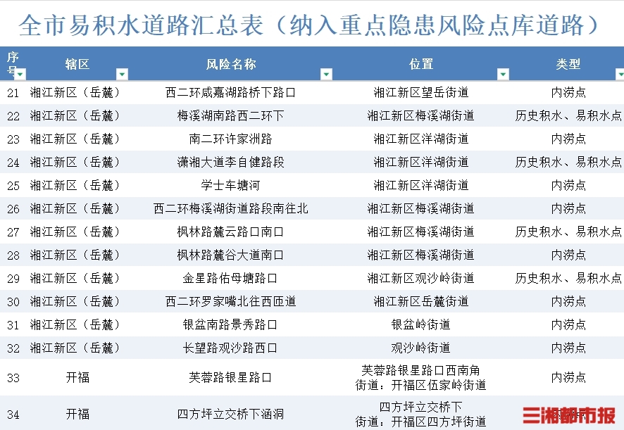 长沙交警同时公布了全市52处易积水路段,交警部门提醒,暴雨天气会导致道路湿滑,能见度低,驾车出行前务必留意天气、路况信息,如遇有积水路段,请减速或停车观察,水位较高应尽量绕行,切勿“以车试水”。