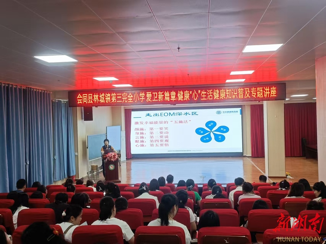 科教新报·新湖南客户端讯(通讯员 李玲 黄柏林 赵燕飞)5月22日,会同县林城镇第三完全小学邀请安全健康教育网的杨兰平讲师,来校开展以“爱卫新篇章,健康‘心’生活”为主题的健康知识普及讲座,旨在全面助力健康湖南行动,提高教师们的健康水平,引导大家摒弃不健康的思想和生活观念,普及健康防病知识,提高全体教职工的治病防病能力,引领健康新风尚。