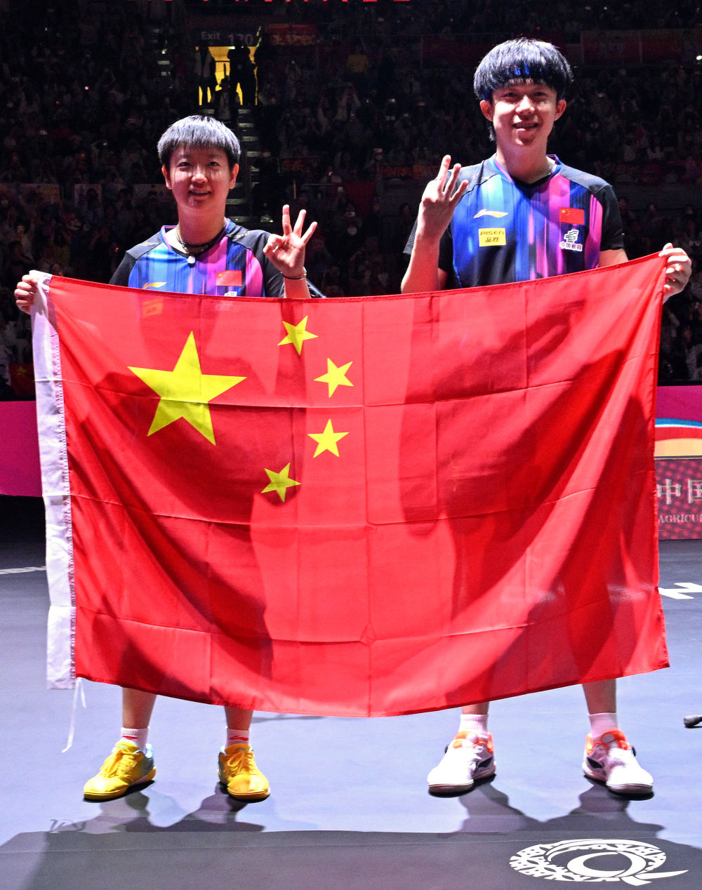 新华社多哈5月24日电(记者王海洲、汪强)随着拿下制胜一分,“莎头”组合24日在多哈世乒赛卫冕混双冠军,潮水般的欢呼声和呐喊声响彻卢赛尔体育馆。王楚钦和孙颖莎手持五星红旗,对着镜头比出“三连冠”的手势,脸上露出灿烂的笑容。