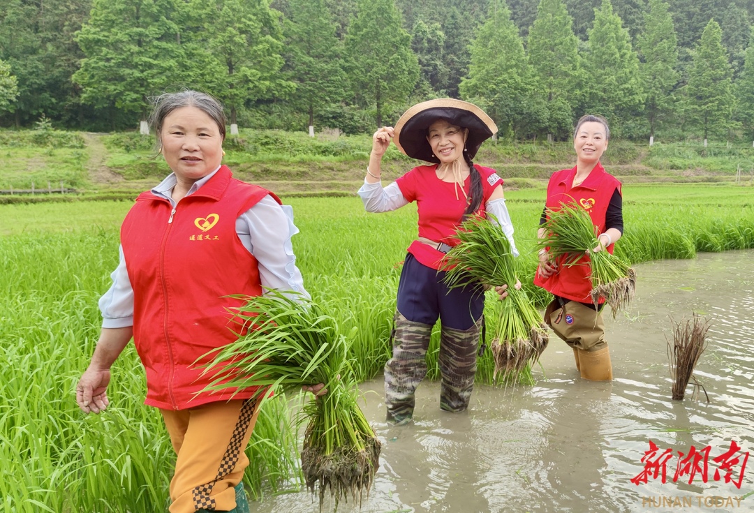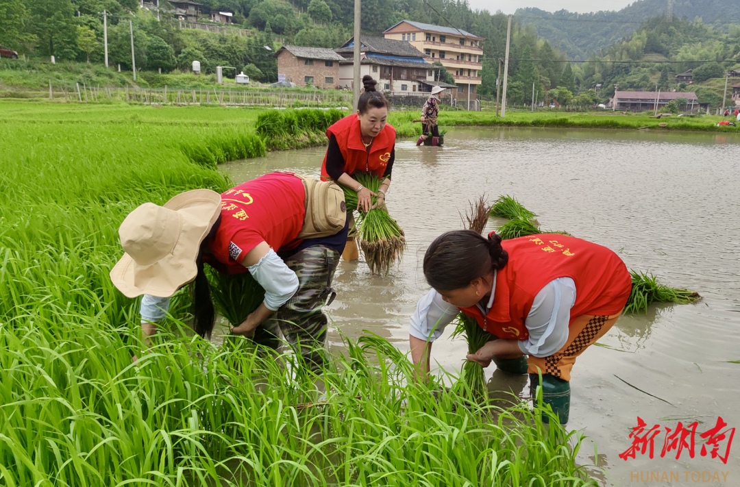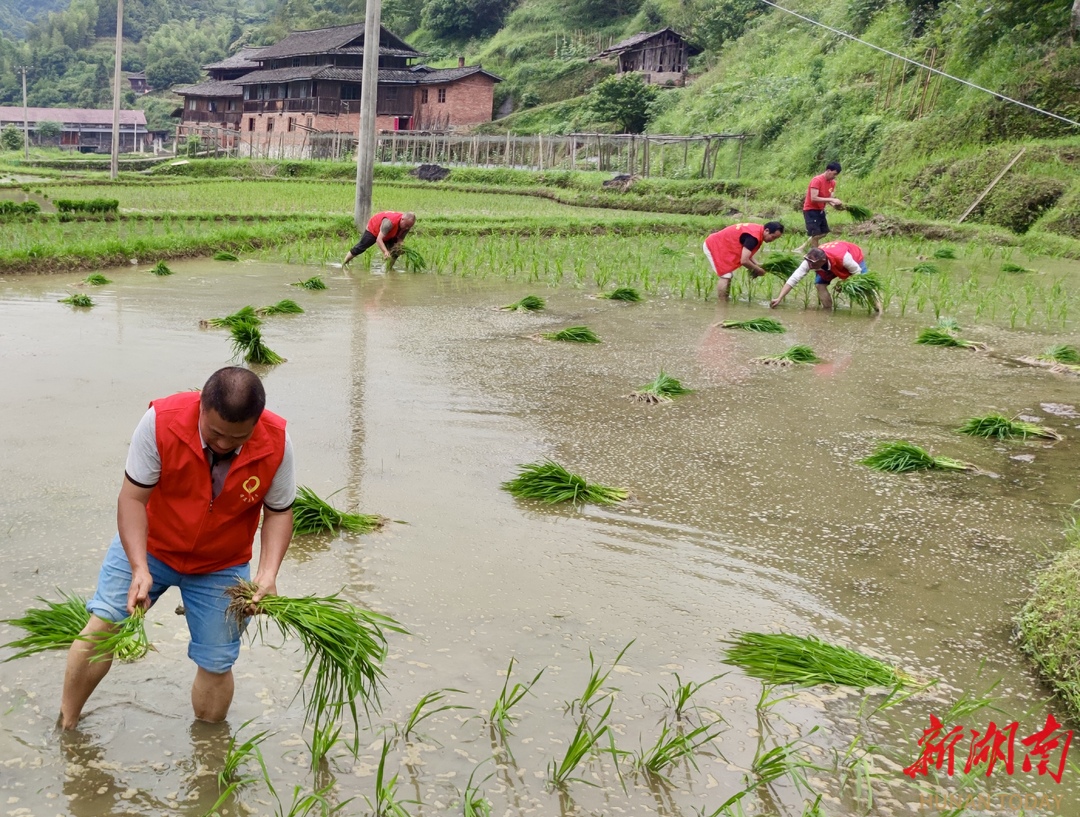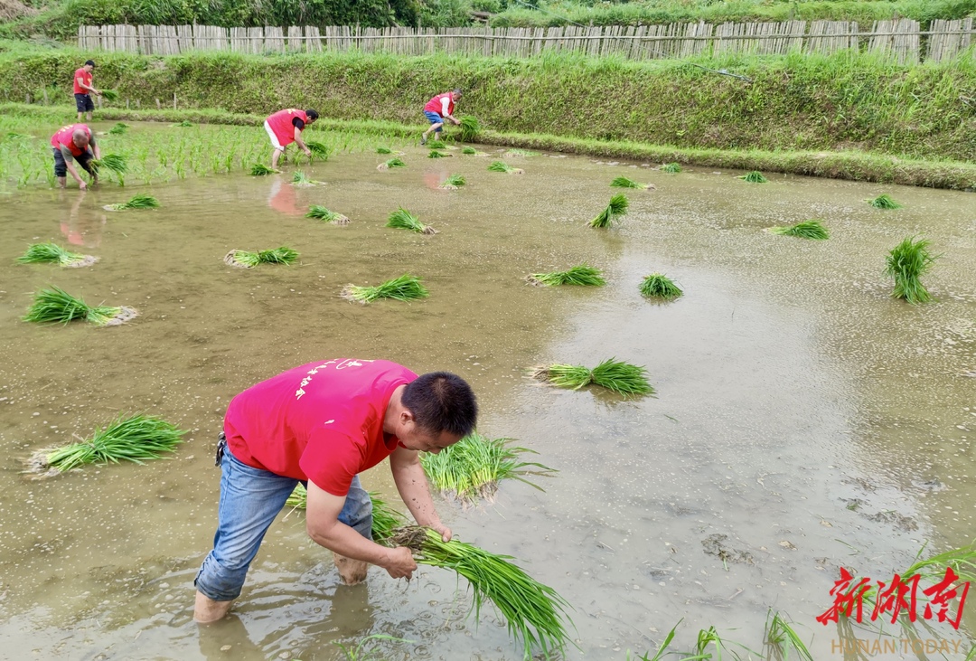5月29日,通道侗族自治县双江镇竹塘村,该县志愿者协会的20多名志愿者走进田间地头,为缺少劳动力的家庭插秧,汗水浸透了红马甲,田间地头添新绿。通讯员 陈志珍 陈俊宇 杨春艳 摄