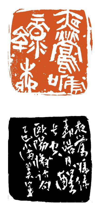 形制溯源与空间重构:突破方寸印面的传统窠臼,大胆取法印陶特有的形态。其朱文印边缘,刻意保留并强化泥土受压后特有的“自然变形线质”,斑驳起伏的边界,非为残缺,实乃对陶泥塌陷瞬间原始肌理的精妙模拟与空间再创造,赋予印面一种凝固的动态与历史的呼吸感。