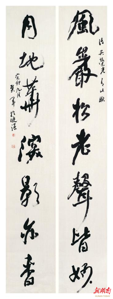 刘翼军入展全国第十三届书法篆刻展并入进京展的行书《风岩月地联》和草书《风度人随联》,书法评论家对其评价:“其行书如‘风樯阵马’,深得米芾‘刷字’的迅疾与骨力,在疾驰的笔势中蕴藏千钧之稳;其草书则取法黄庭坚、王铎‘欹侧取势’,暗合明代王宠的通脱之趣,森严如铁律,意态却豪迈不羁,于‘似与不似’的微妙境界中,完成了对古人神髓的现代重构与精神对话。”这种表现力,正是刘翼军对晚明时期“浪漫主义”书风精髓的承续与发扬。晚明书风以巨幅行草为基本特征,重在表现,以抒发情感为主要目的,由徐渭发其端,经张瑞图、黄道周、倪元璐、王铎、傅山等大家推波助澜,形成了中国帖学史上最为光彩夺目的一页,他们以左牵右掣、纵横跌宕的横向运笔,风卷残云般的行气,生辣拙朴、遒劲婉丽的笔墨,以及钢筋铁骨般的线条与神出鬼没的速度力量,解决了巨幅立轴创作的难题,大大拓展了帖学的表现力。刘翼军正是站在这些巨人的肩膀上,以其对传统经典的深刻理解和时代精神的敏锐捕捉,演绎着属于自己的笔墨交响。