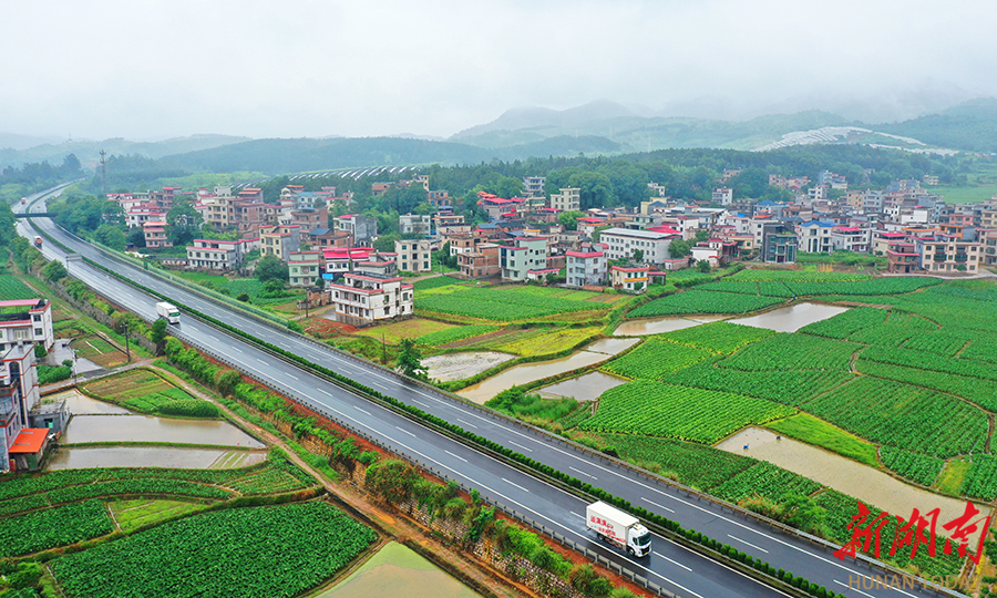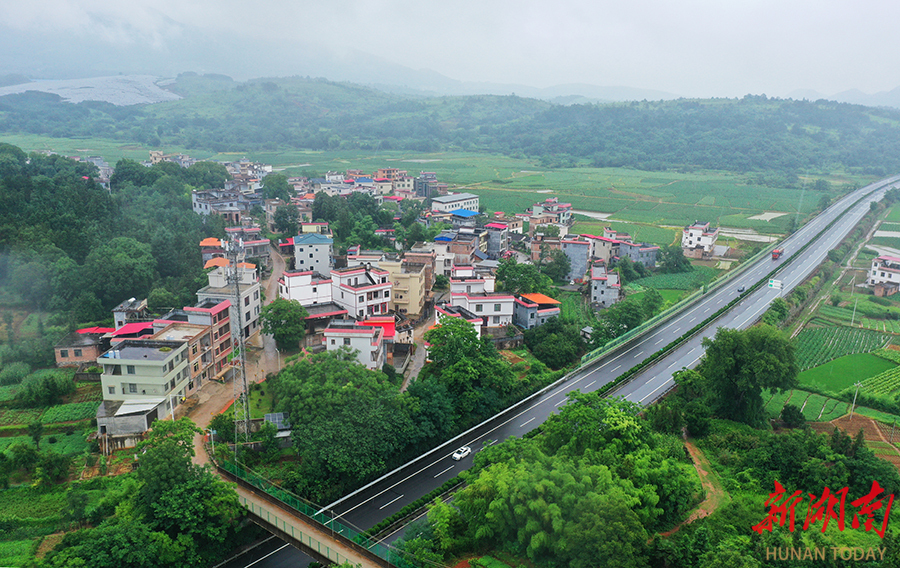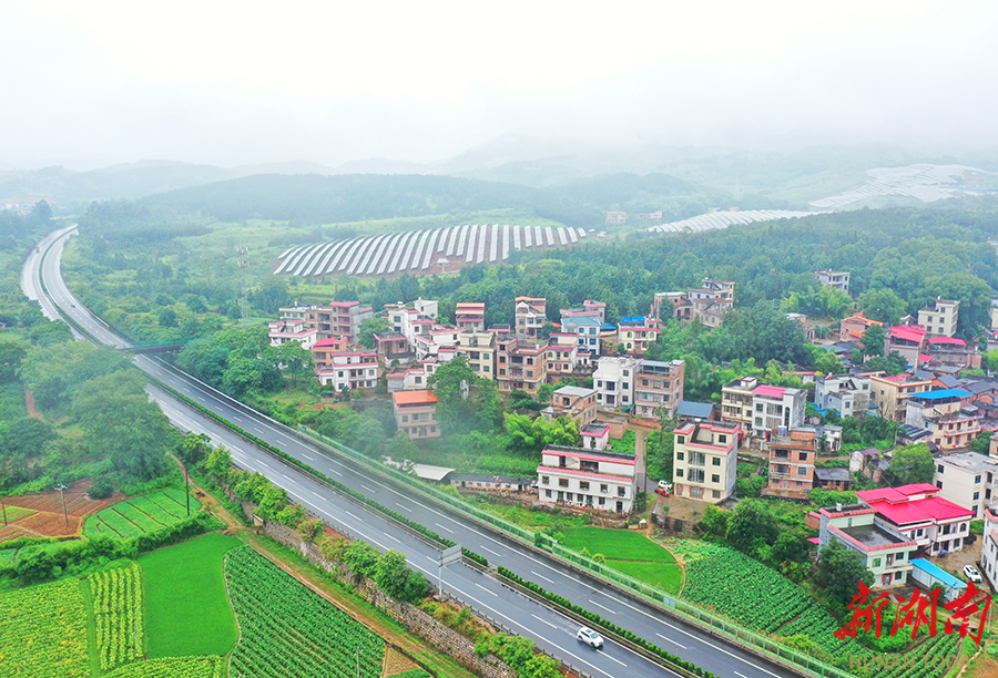 6月10日,蓝山县土市镇,穿境而过的厦蓉高速公路与广阔田园、村居民房、光伏电场相互映衬,构成一幅美丽的交通图景。 黄春涛 摄(湖南图片库)