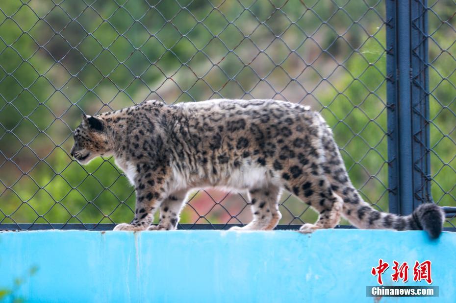 6月10日,中国首只人工繁育成活的雌性雪豹“傲雪”迎来9岁生日。生日当天,西宁野生动物园的饲养员为它定制了特别的棒骨“生日蛋糕”,以鲜嫩肉片和营养棒骨为主料,用胡萝卜精心拼出“生日快乐”字样。图为“傲雪”在馆内行走。中新社记者薛蒂摄