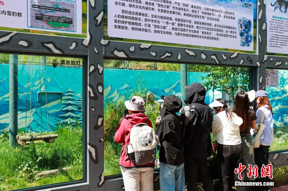 6月10日,中国首只人工繁育成活的雌性雪豹“傲雪”迎来9岁生日。生日当天,西宁野生动物园的饲养员为它定制了特别的棒骨“生日蛋糕”,以鲜嫩肉片和营养棒骨为主料,用胡萝卜精心拼出“生日快乐”字样。图为游客在雪豹馆前浏览。中新社记者薛蒂摄