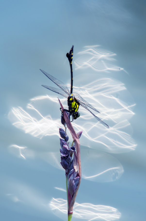 多重曝光技术被赋予东方美学的时空观照。周立春创造性地将蜻蜓生命周期的不同阶段叠印在同一画面,幼虫的透明与成虫的斑斓在曝光叠加中形成"三远法"的空间纵深。