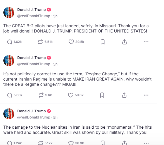特朗普称,伊朗的三个核设施被摧毁,而他确切地知道哈梅内伊藏身何处,他不会让以色列或者美国武装部队终结哈梅内伊的生命。特朗普表示,在战争的最后关头,他还要求以色列调回一支规模庞大的空军部队,这些空军部队直飞德黑兰,意图制造一场大战。这将是迄今为止最大规模的袭击,且将会造成巨大的破坏,许多伊朗人将丧生。