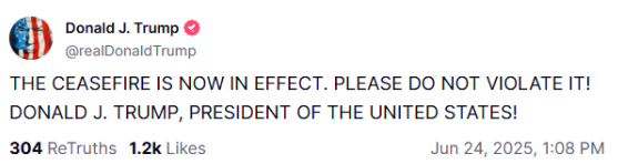 当地时间6月27日,美国总统特朗普在其社交媒体平台“真实社交”上发文表示,伊朗最高领袖哈梅内伊明知自己的声明是谎言,却宣称伊朗赢得了对以战争,而事实并非如此。