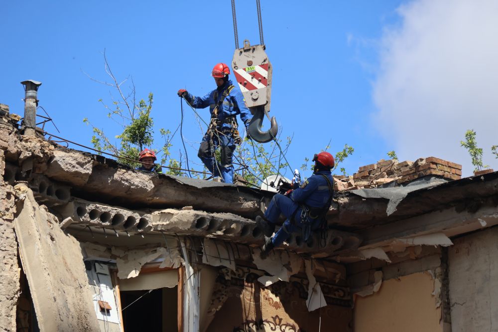 ↑6月23日,乌克兰国家紧急情况局工作人员在基辅市的舍甫琴科夫斯基区遭空袭现场进行搜寻和清理工作。