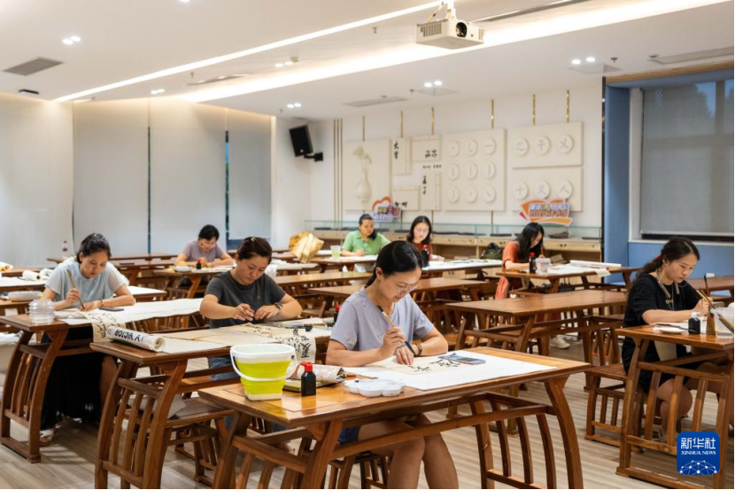 The photo, taken on July 9, shows students practicing calligraphy at the Hunan Xiangjiang New Area Cultural Center. (Photo/Chen Sihan, Xinhua)